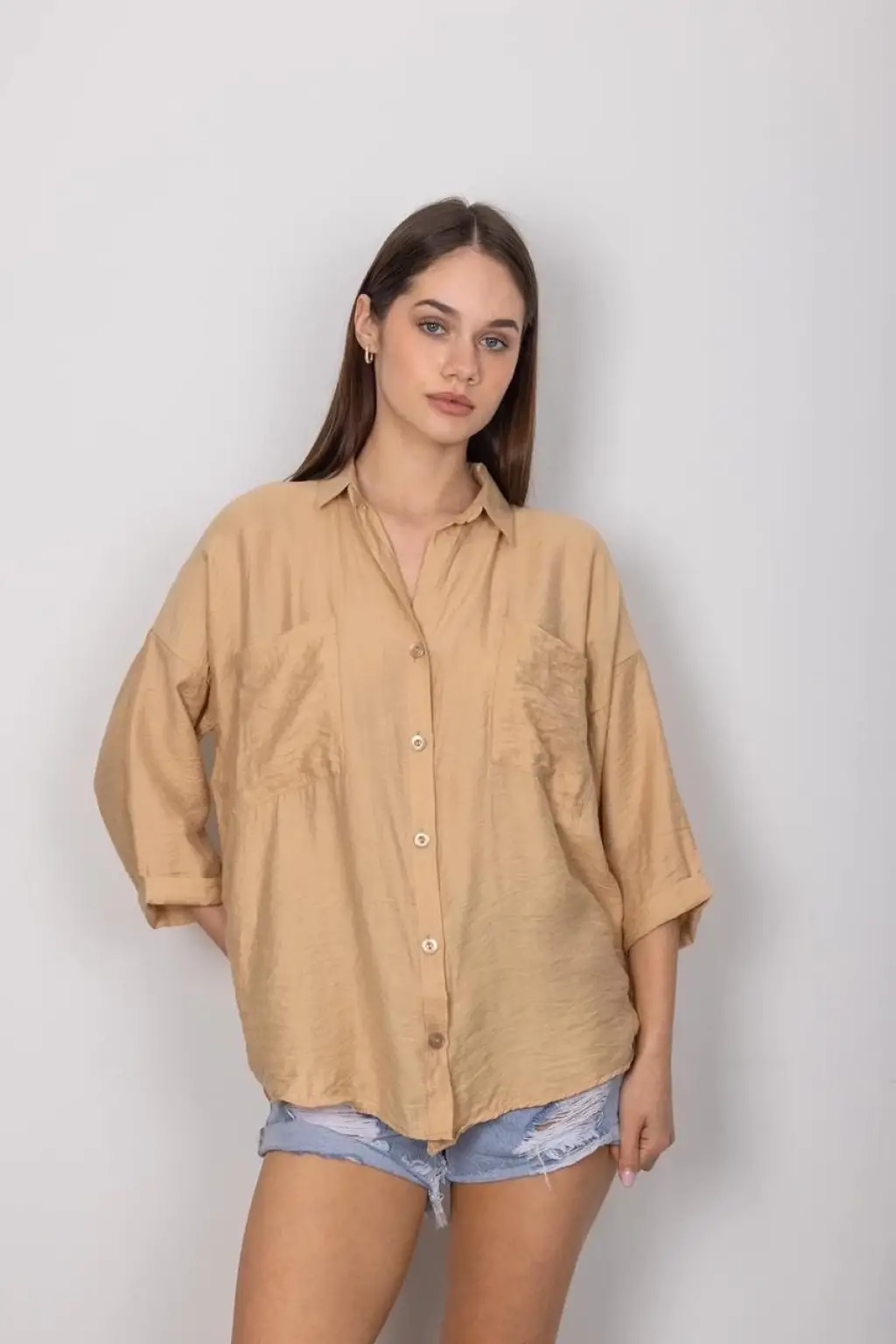 Çift renkli kısa gömlek krem s4021