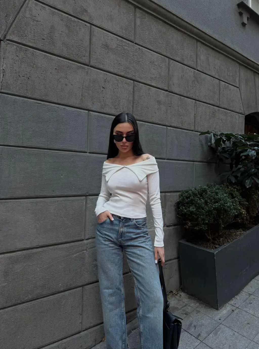 Kelebek yaka uzun kol bluz beyaz, şıklığı ve rahatlığı bir arada sunar.