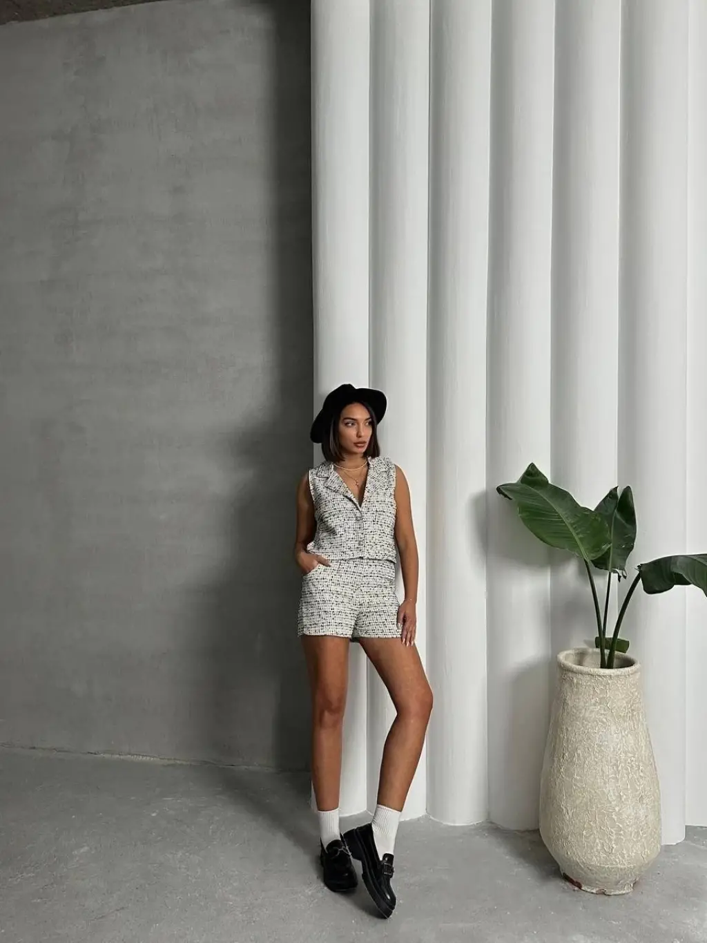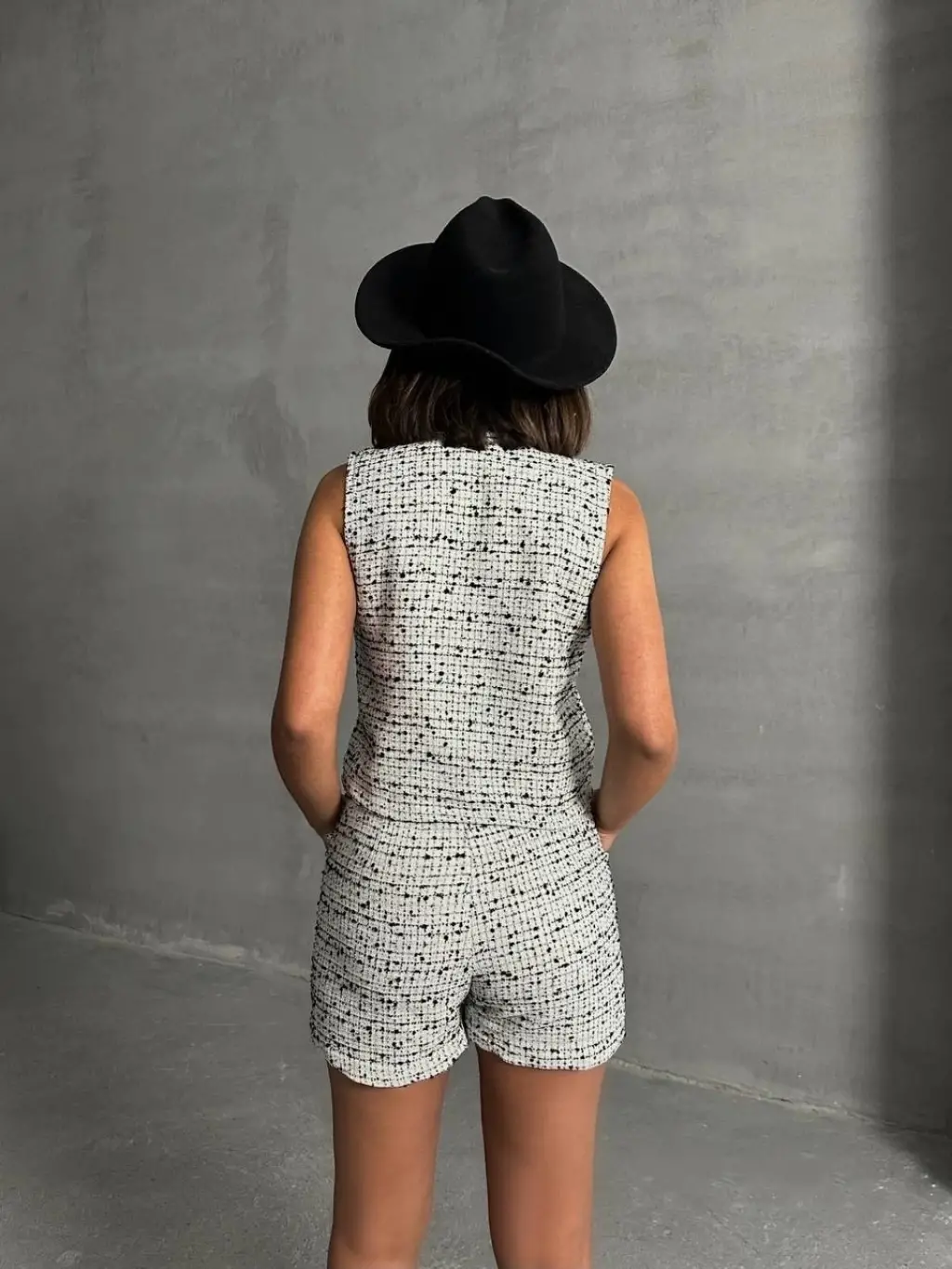 İki düğmeli kaz ayağı desen ch kumaş şort etek siyahbeyaz h26414