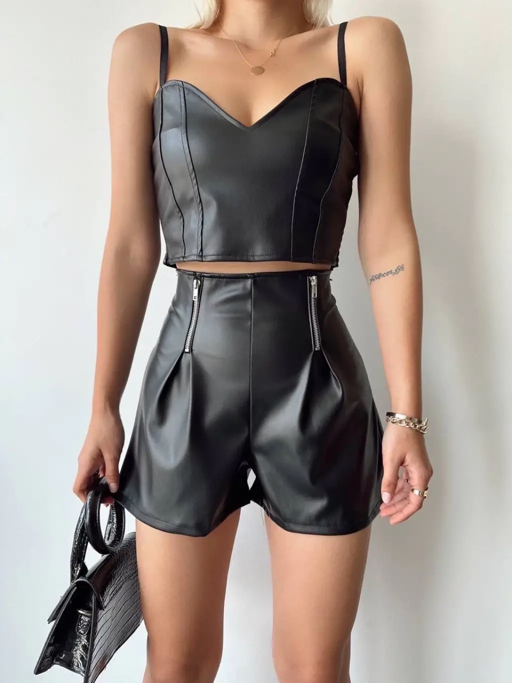 Çift fermuarlı deri şort h24394, şıklığı ve rahatlığı bir arada sunar.