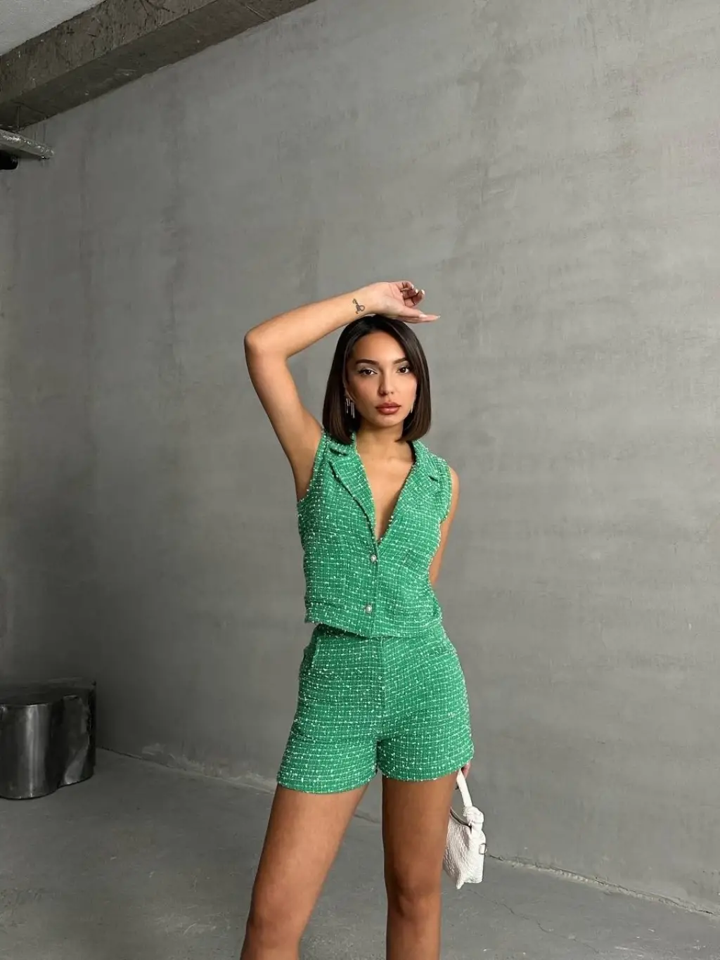 Yelekli şort takım Yeşil ile tarzınızı yansıtın, şıklığı ve rahatlığı bir arada yaşayın.