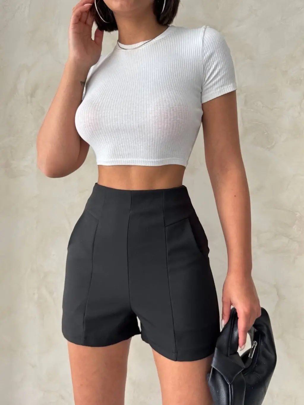 Yüksek bel parçalı double kumaş şort, hem şık hem de rahat bir seçenektir.